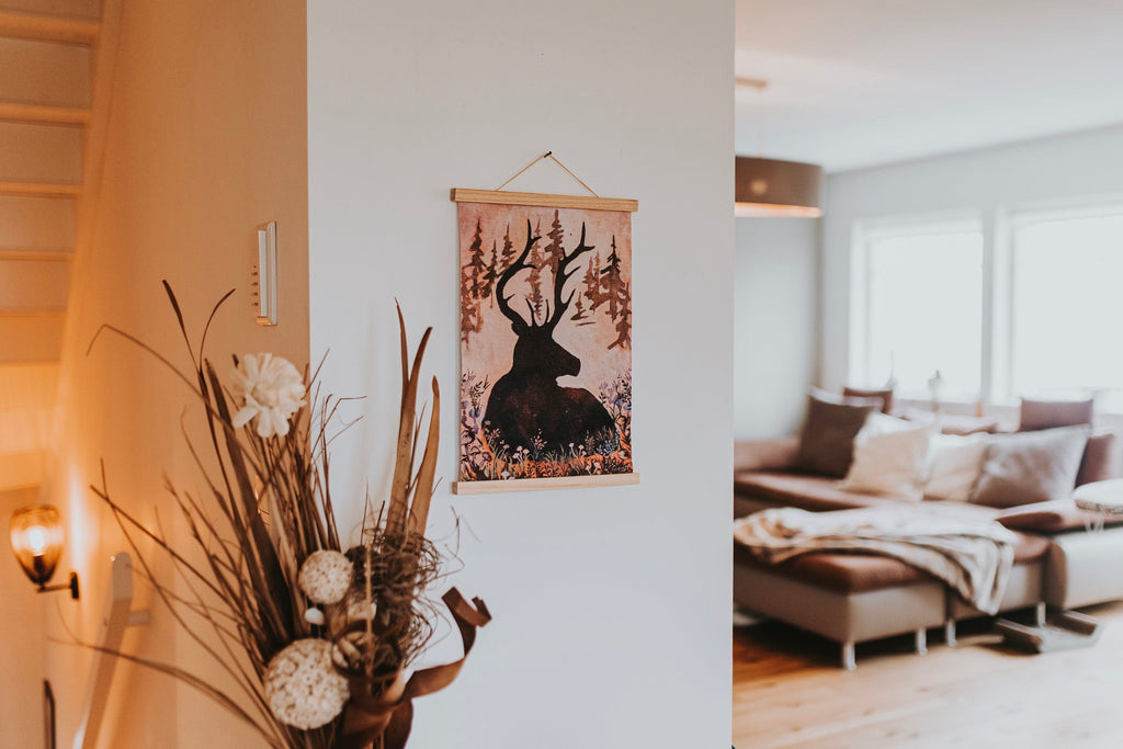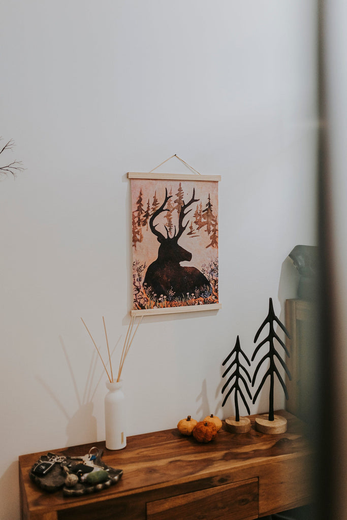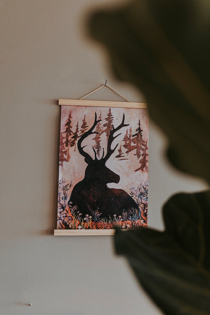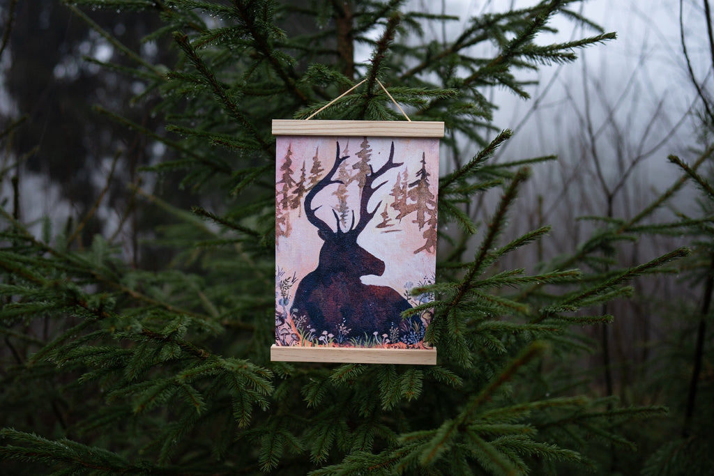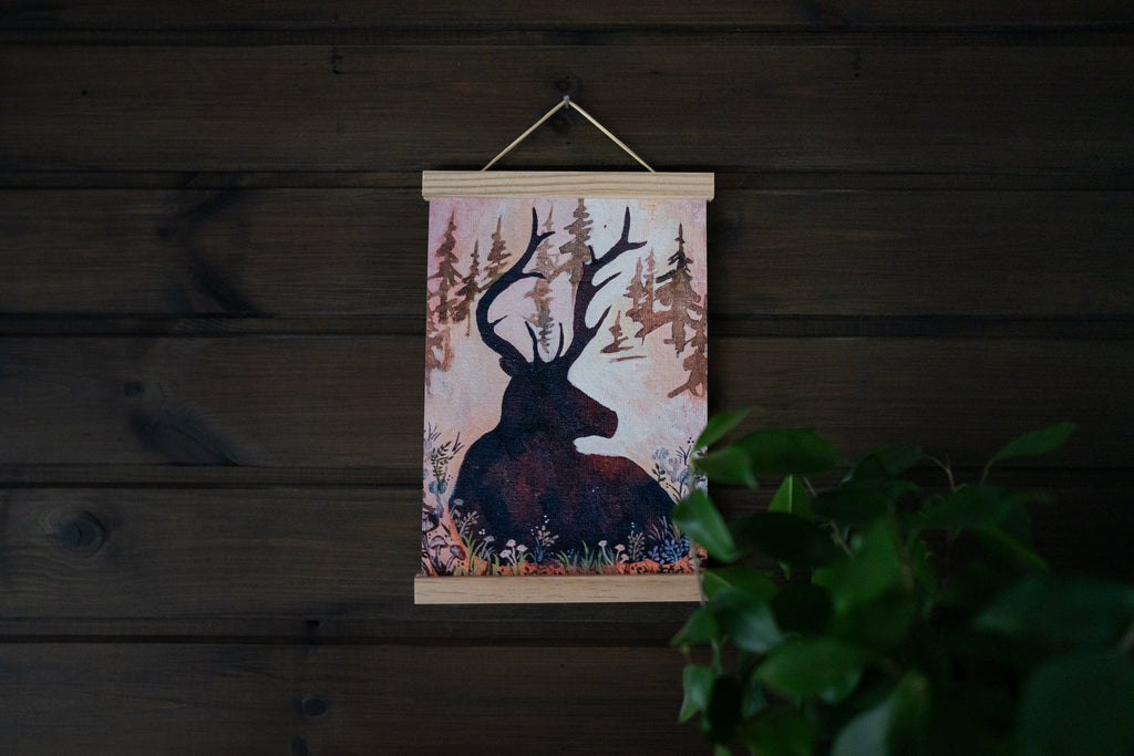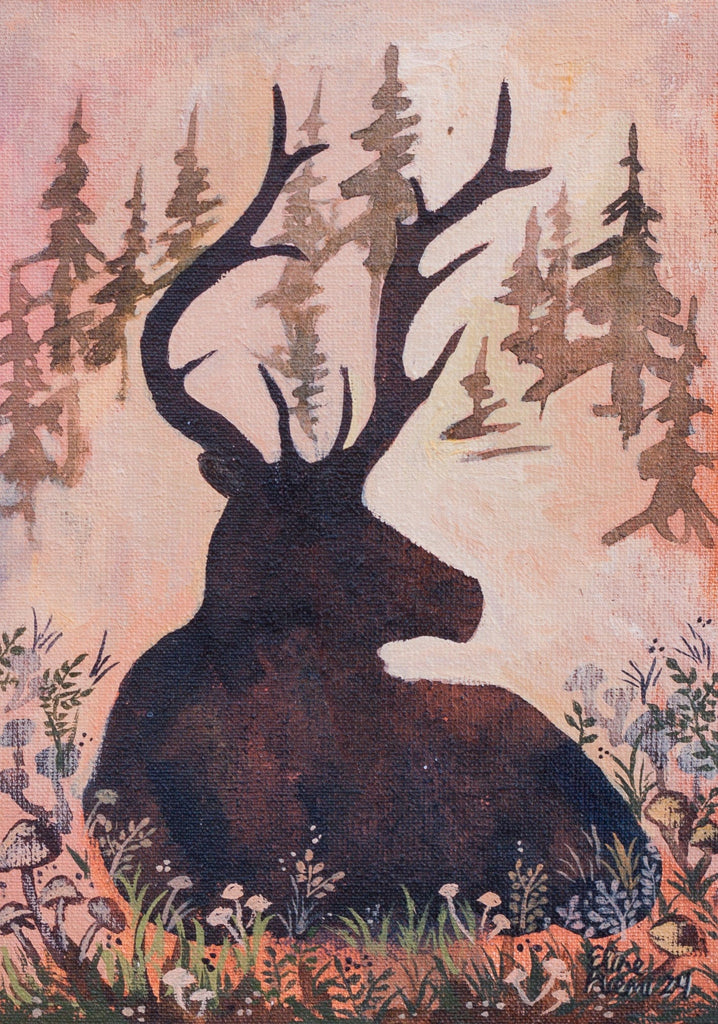 Escape to a peaceful forest with my "A Good Place To Rest" art print. Featuring a serene scene of reindeer among mushroom patches and tree silhouettes, this print brings a sense of calm and relaxation to any space.